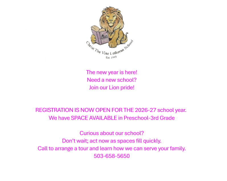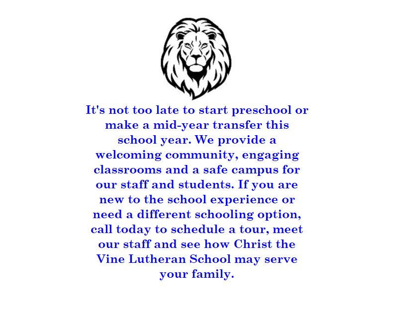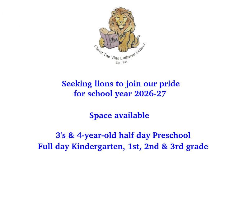 Christ the Vine Lutheran School does not discriminate on the basis of race, color, national or ethnic origin in the administration of its educational policies, admissions policies, tuition assistance, or any other school administered programs.